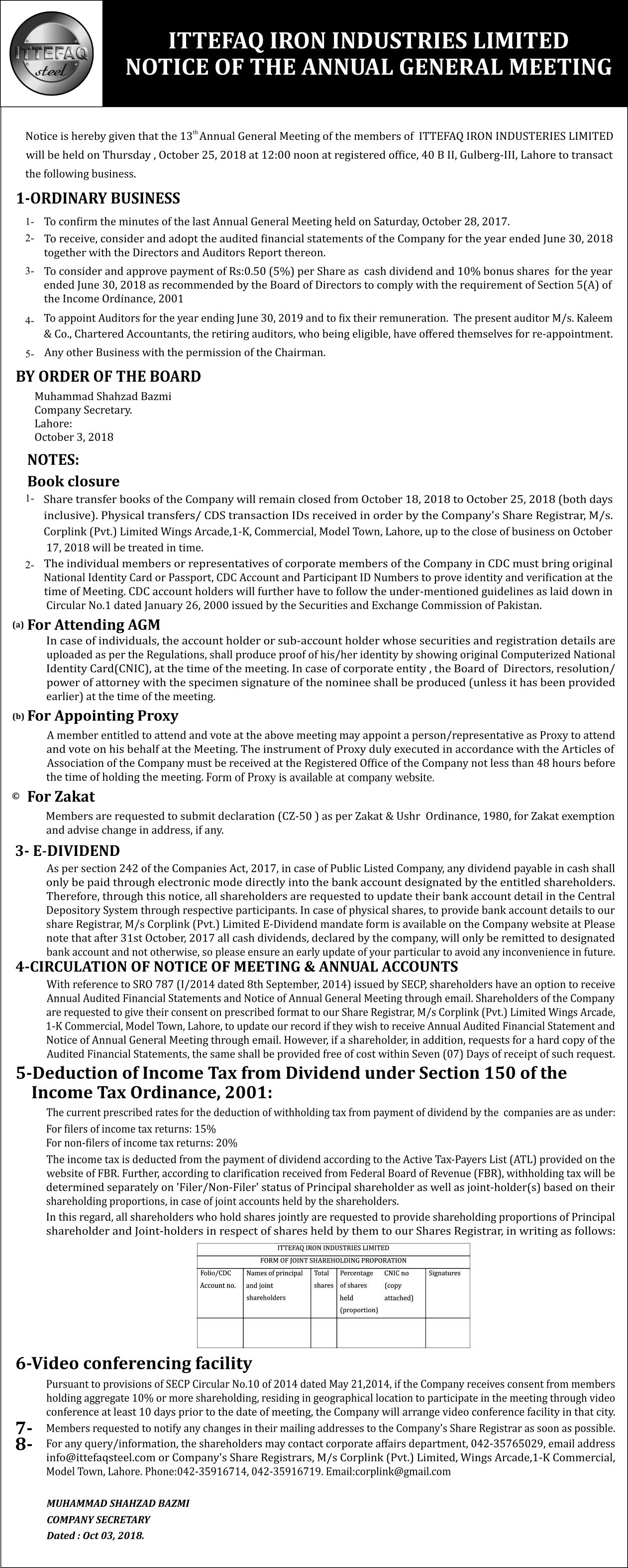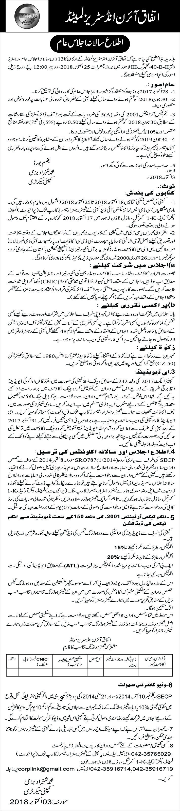 Notice OF AGM for the year ended 2018 (Urdu)